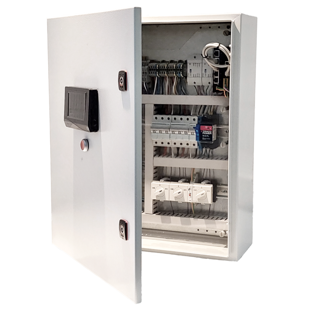 Für komplexe Projekte empfiehlt sich der Aufbau der Steuerung in einem Schaltschrank, in dem alle Ein- und Ausgänge übersichtlich auf Klemmen geführt werden. Das reduziert den Verkabelungsaufwand bei der Elektroinstallation vor Ort, sorgt bei grossen Anlagen für einen sauberen Abschluss und ermöglicht eine Bedienung an der Schrankfront, die perfekt an die Kundenbedürfnisse angepasst werden kann. Auch Gehäuse, Grösse, Material und IP-Schutz können flexibel an die jeweiligen Anforderungen angepasst werden.