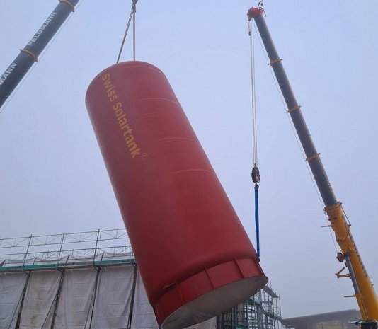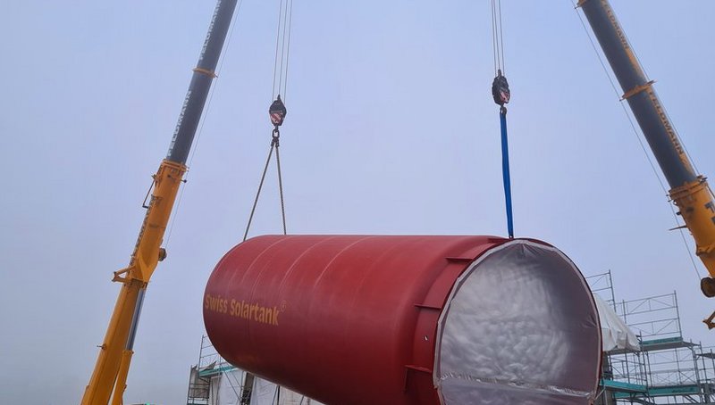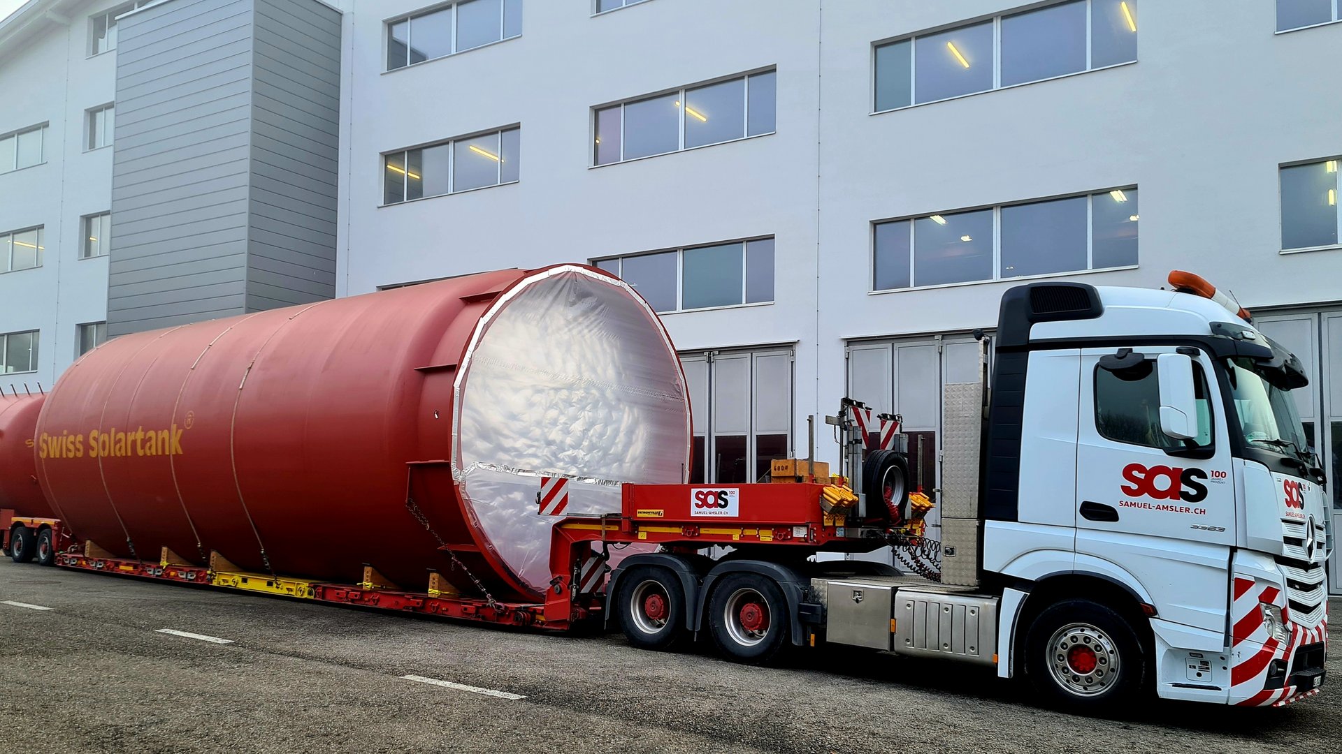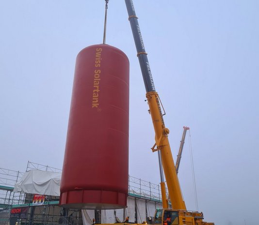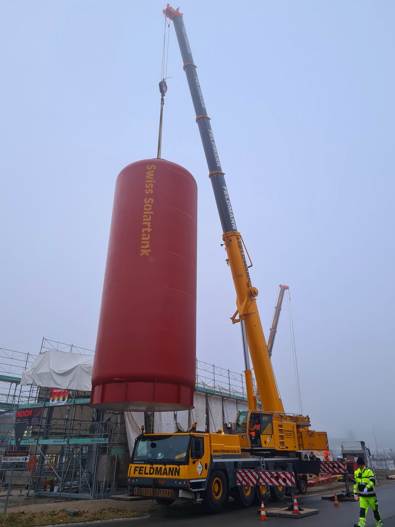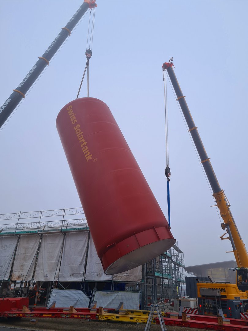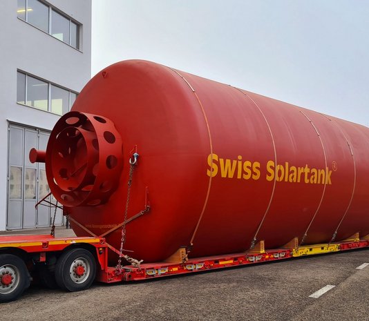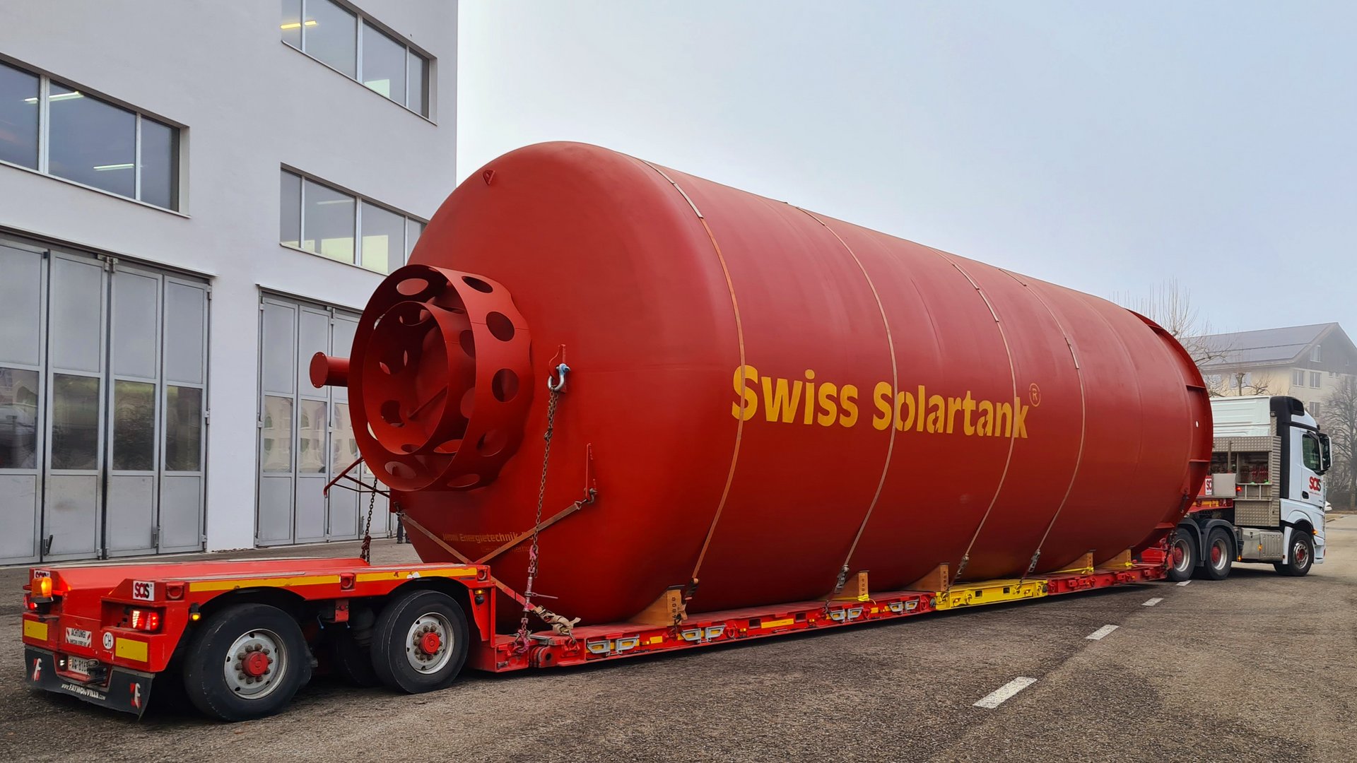 Mit 220'300 Liter Fassungsvermögen und 15'370 kWh Energieinhalt konnte Jenni Energietechnik AG diese Woche mit einer Nachtfahrt den drittgrössten bisher produzierten Speicher nach Eglisau liefern.