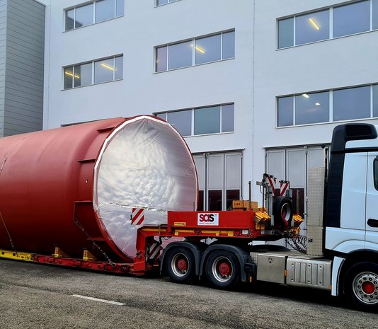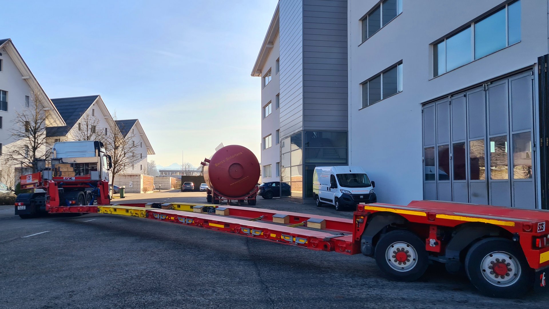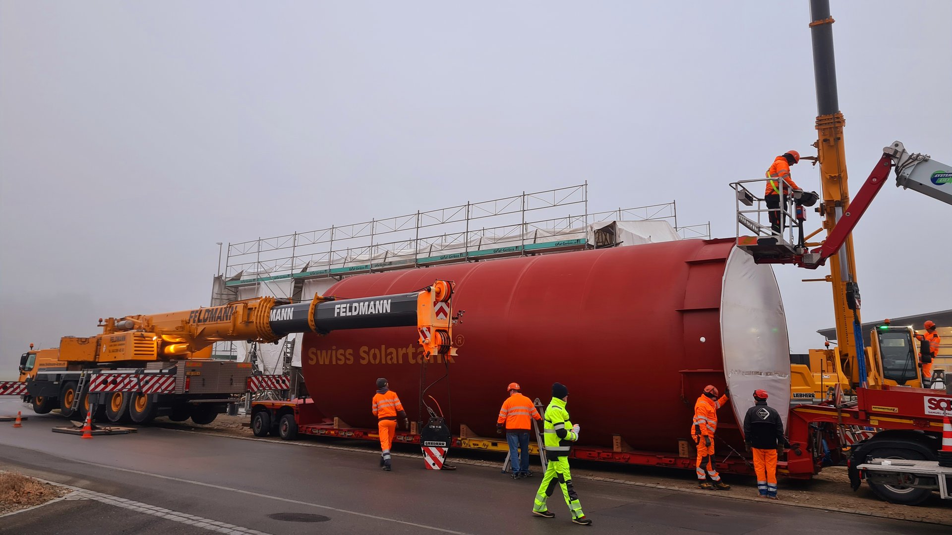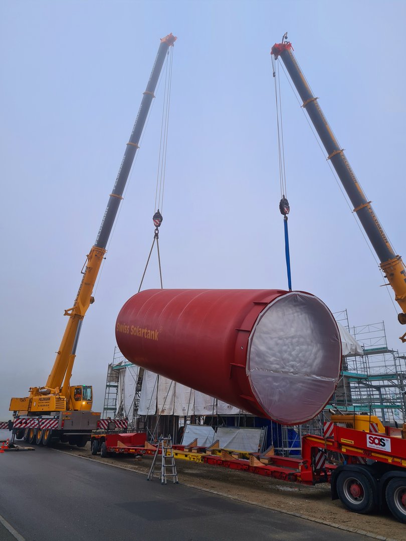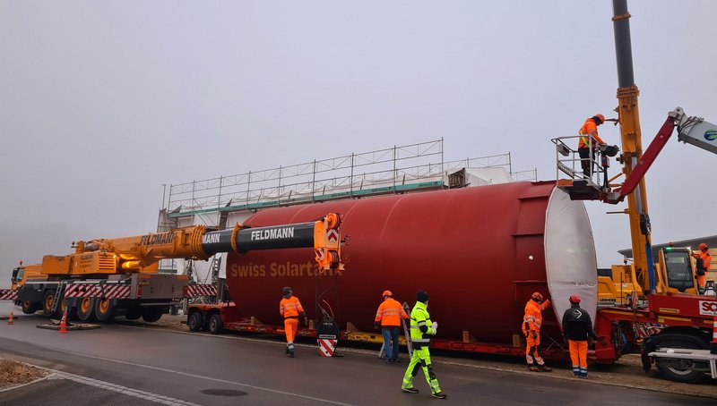 Mit seinem Durchmesser von 4.8 Meter wurde das Maximum punkto Transportfähigkeit ausgereizt. Die Transportprofis von Samuel Amsler AG haben den Koloss sicher ans Ziel gebracht und mit Feldmann Kran platziert.