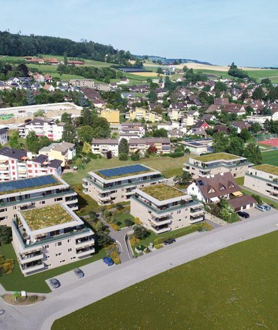 An der Bachperle in Mettmenstetten stehen 6 Gebäude mit insgesamt 53 Wohnungen. Zwei Kollektorfelder mit insgesamt 180m² generieren jährlich rund 100 000 kWh Wärme.