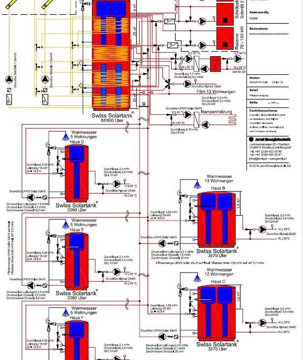 Der Gebäudepark wird zusätzlich mit zwei Holzschnitzelkessel geheizt. Eine 89 000 Liter Zentrale und 5 Unterstationen mit insgesamt 13 920 Liter speichern und verteilen die Energie. Das Management der ganzen Anlage übernimmt unsere Steuerung.