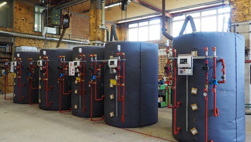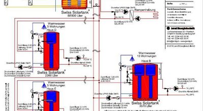 Der Gebäudepark wird zusätzlich mit zwei Holzschnitzelkessel geheizt. Eine 89 000 Liter Zentrale und 5 Unterstationen mit insgesamt 13 920 Liter speichern und verteilen die Energie. Das Management der ganzen Anlage übernimmt unsere Steuerung.