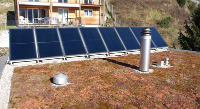 Das Gebäude wird durch eine Fußbodenheizung temperiert. Diese wird fast ausschließlich durch Solarkollektoren auf dem Dach betrieben. Die Solaranlage stellt im Jahresdurchschnitt ca. 66% der Energie für Heizung und Warmwasser bereit. Nur an sehr kalten und bewölkten Tagen muss mit dem Kamin zugeheizt werden. Ein Wärmetauscher über dem Kaminfeuer erzeugt dann Warmwasser.