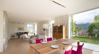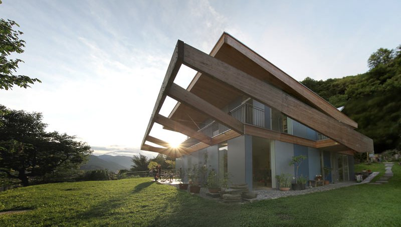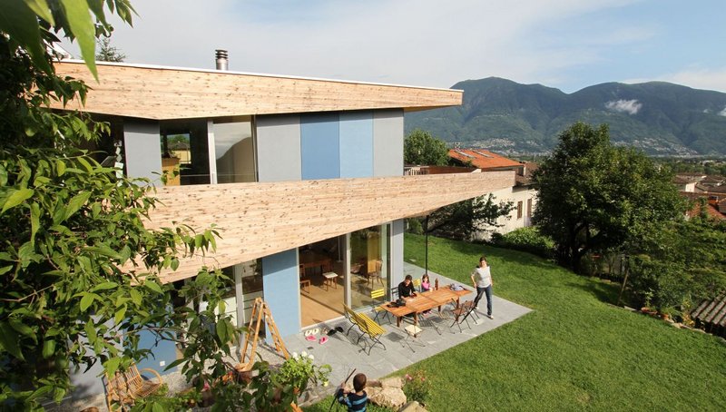 Das Grundstück für dieses 200 m² Einfamilienhaus liegt am Rande von Solduno, einem alten Dorfkern in unmittelbarer Nähe von Locarno. Man genießt ein 200° Panorama mit Blick auf Ascona und den Lago Maggiore. Die Bauherren sind eine Familie mit drei Kindern.