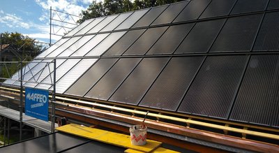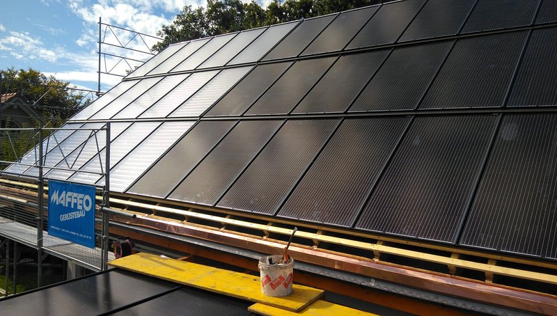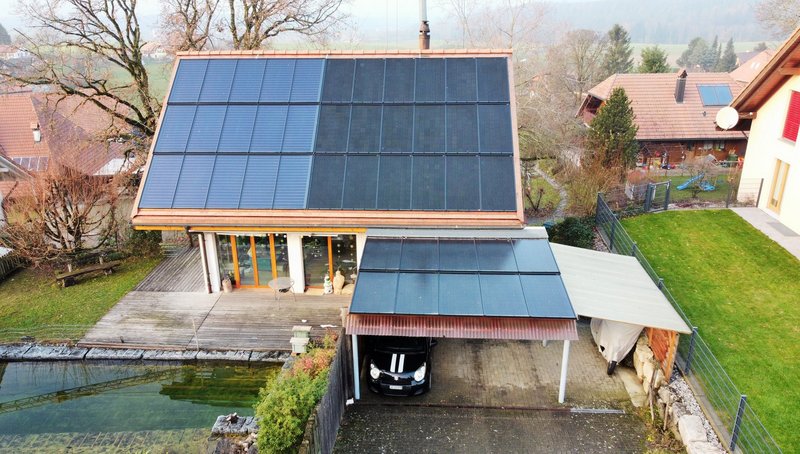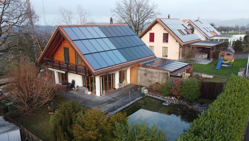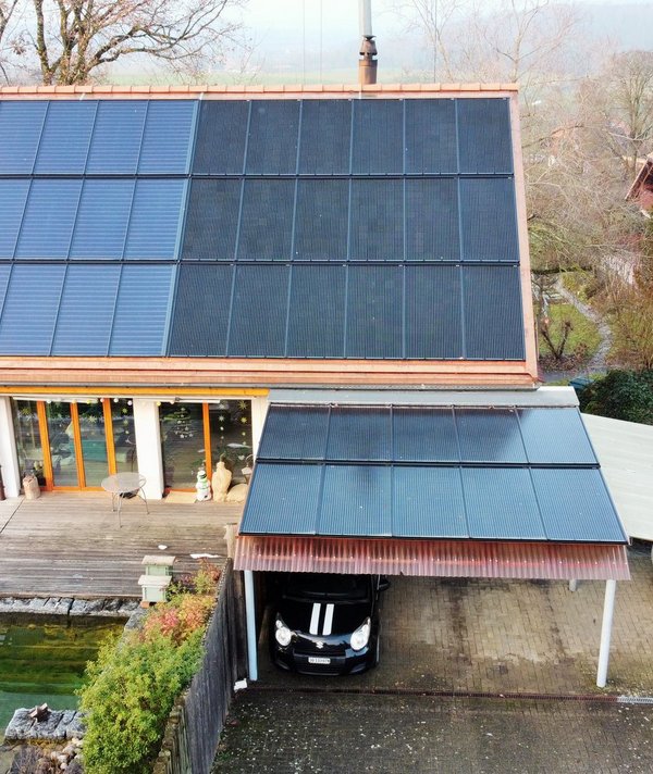 Die 22-jährigen Sonnenkollektoren wurden im Zuge einer Dachsanierung ersetzt und mit Photovoltaik erweitert. Der Überschuss an Strom wird für das Aufladen des Elektroautos verwendet. Liefert die Sonne einmal nicht genug Wärme, heizt die Bauherrschaft mit einem Kaminofen nach.