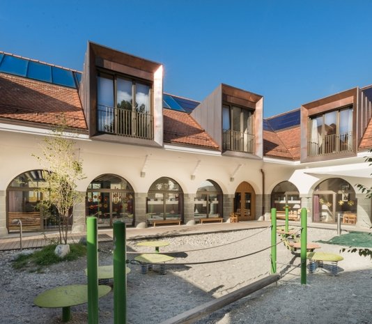 Vor der Sanierung verbrauchte der Gebäudekomplex mit Doppelkindergarten und zwei Dachwohnungen aus dem Jahr 1914 rund 184'300 kWh/a. Dank Wärmedämmung, solarer Direktgewinnenen und moderner Solartechnik konnte der Energiebedarf um 84 % auf nur noch 29'400 kWh/a gesenkt werden. Die kombinierte PV- und Solarthermieanlage erzeugt jährlich 28'300 kWh und deckt damit 95 % des Eigenenergiebedarfs, während Überschüsse an das benachbarte Mehrfamilienhaus geliefert und im Winter durch eine Pelletheizung ergänzt werden. Mit diesem nahezu ausgeglichenen Energiekonzept erhielt das Gebäude 2016 das Schweizer Solarpreis-Diplom.