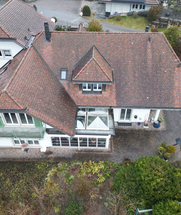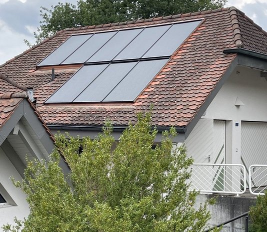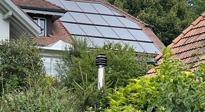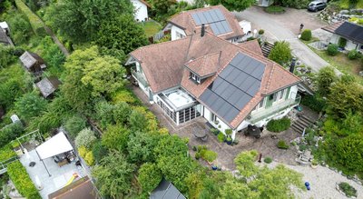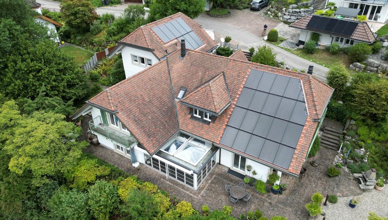 Wo wir bereits einige Solarthermie-Module im Garten realisieren konnten, konnten wir nun auch noch mit einer Indach-Photovoltaikanlage ergänzen. Auf dem Hauptdach und dem Dach des Anbaus sind zusammen knapp 50 m2 PV-Module verbaut worden. Zusammen mit der Batterie ist das Haus bestens gerüstet, um an sonnigen Tagen den Eigenstrom abzudecken und Tag Nacht Unterbrüche zu überbrücken.