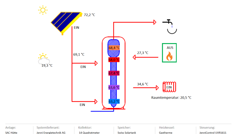 Die auf 2'450 Meter über Meer liegende SAC-Hütte wurde im Sommer 2014 komplett saniert und mit einer thermischen Solaranlage mit Swiss Solartank sowie einer Photovoltaik-Inselanlage ausgerüstet. Fernwartung und Überwachung der
