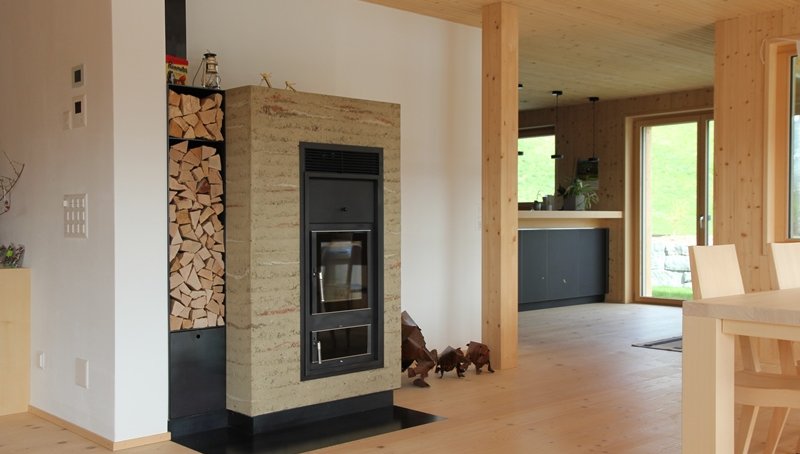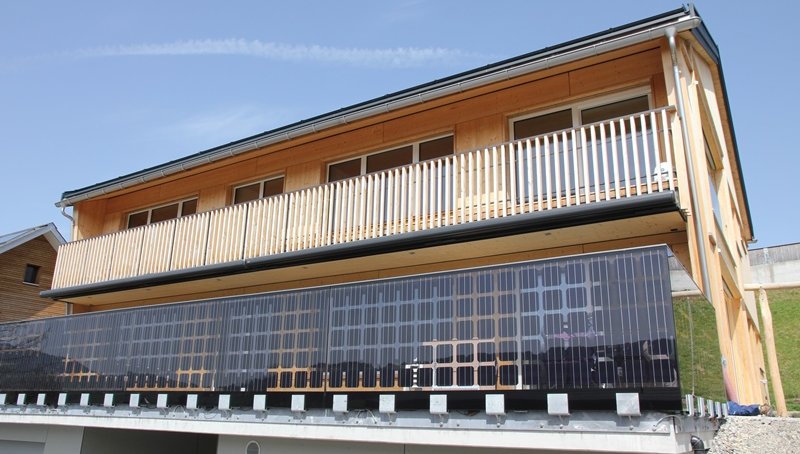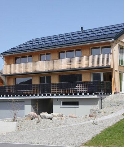Solarthermie kombiniert mit einem grossen Kombispeicher sorgen im gut gedämmten Haus für die Hauptheizung. Um die kalten Wintertage zu überbrücken, wurde ein wasserführender Kaminofen installiert. Die restliche Dachfläche und das Geländer der Terrasse wurden mit Photovoltaik ausgestattet. So erreicht das Haus einen solaren Deckungsgrad von etwa 75 %.