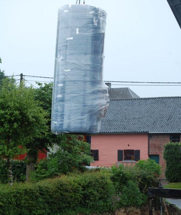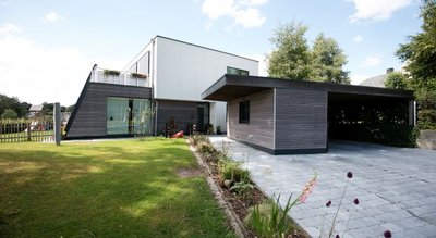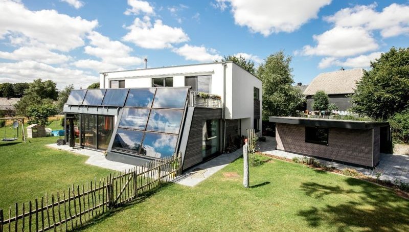 Dieses Sonnenhaus lebt von der aktiven und passiven Sonnenenergienutzung. Die Kollektoren sind mit 70° Neigung für einen maximalen Winterertrag ausgerichtet. Auch wurde bei der Architektur darauf geachtet, dass das Gebäude